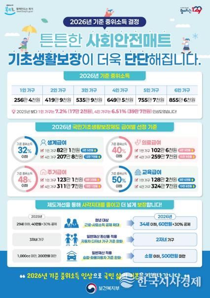 2026년도 기준 중위소득은 1인 가구 기준 256만 4천 원으로, 지난해 239만 2천 원 대비 7.2% 인상된다. 이에 따라 1인 가구의 기초생계급여 지원액도 기존 76만 5천 원에서 82만 원으로 상향 조정된다.