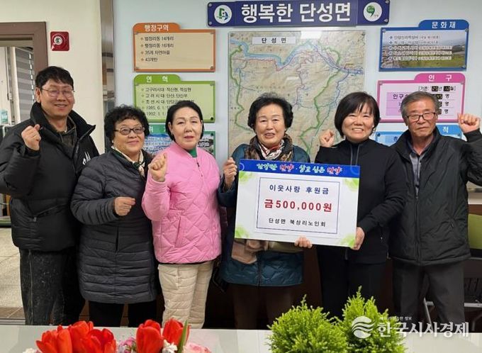 한국시사경제 충북취재본부 | 단양군 단성면 북상리 노인회는 지난 28일 지역사회 나눔 실천의 일환으로 단성면 지역사회보장협의체에 이웃사랑 후원금 50만 원을 전달했다.