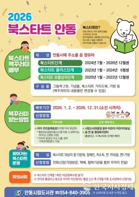 『북스타트 안동』은 영유아기부터 책과 친숙해질 수 있는 환경을 조성하고, 가정과 지역사회 전반에 책 읽는 문화를 확산하기 위해 아이들의 연령별로 책꾸러미를 지원하는 사업이다. 책꾸러미는 ▲1단계 ‘스타트’ (2024년 7월생~2026년 12월생) ▲2단계 ‘플러스’ (2023년 1월생~2024년 6월생), ▲3단계 ‘보물상자’ (2020년 1월생~2022년 12월생)로 구성되며, 각 단계별로 한 번만 수령할 수 있다.