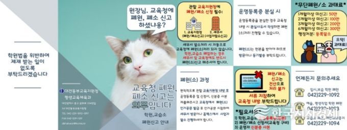 이번 안내 리플릿은 폐업으로 인한 사업자 말소 신청을 위해 세무서를 방문한 민원인에게 세무서뿐만 아니라 교육청에도 반드시 방문하여 폐원·폐소 신고를 해야 함을 알리기 위해 제작됐다. 현행법상 교육청에 신고하지 않을 경우 무단 폐원·폐소로 간주되어 학원법에 따라 300만 원 이하의 과태료가 부과될 수 있다.