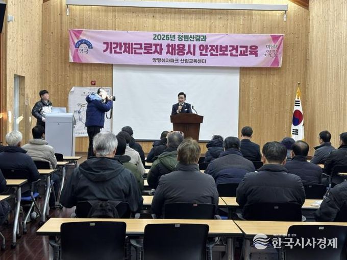 한국시사경제 기동취재팀 | 양평군은 지난 29일 쉬자파크 산림교육센터에서 2026년 정원산림과 기간제근로자로 신규 채용된 근로자 55명을 대상으로 ‘산업안전보건법’에 따른 산업안전·보건 교육을 실시했다.