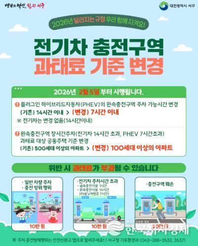 한국시사경제 대전취재본부 | 대전 서구는 전기차 충전 질서 확립과 충전 시설 이용 효율 제고를 위해, 이달 5일부터 전기차 충전 구역 과태료 부과 기준을 변경 시행한다.
