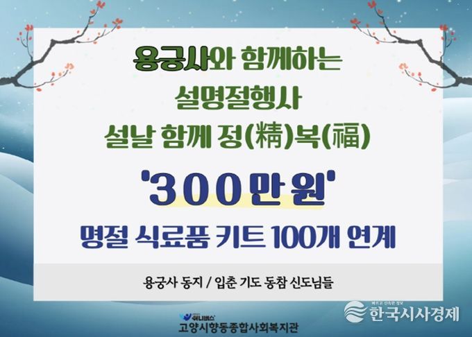 한국시사경제 권충현 기자 | 고양시향동종합사회복지관은 지난 30일 설 명절을 맞아 저소득 주민 약 130명에 과일, 떡국 재료 등으로 구성된 명절 선물을 전달하는 나눔 행사 ‘설날 함께 정(情)복(福)’을 진행했다.