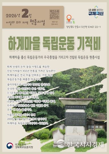 한국시사경제 문화팀 | 경북북부보훈지청은 2026년 2월 이달의 우리 지역 현충시설로 ‘하계마을 독립운동 기적비’(경상북도 안동시 도산면 토계리 22-1)를 선정했다.