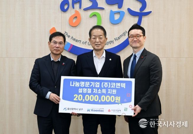 한국시사경제 울산취재본부 | 울산 남구의 대표적 향토기업인 ㈜코엔텍(대표 김재일)은 2일 남구청을 방문해 관내 저소득층 지원을 위한 성금 2,000만 원을 전달했다.