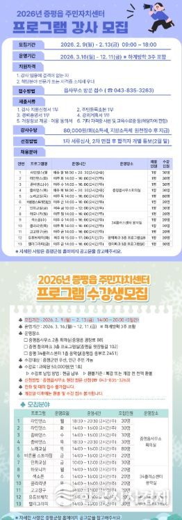 한국시사경제 충북취재본부 | 충북 증평군 증평읍 주민자치센터가 오는 2월 9일부터 13일까지 5일간 2026년도 주민자치센터 프로그램 수강생과 강사를 모집한다.