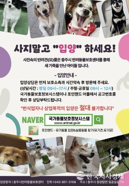 한국시사경제 충북취재본부 | 충주시는 반려동물보호센터에서 보호 중인 유실·유기동물의 장기체류와 안락사를 예방하고 입양을 활성화하기 위해 ‘입양비 지원사업’을 실시한다고 4일 밝혔다.