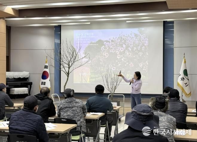 한국시사경제 경북취재본부 | 상주시는 2월 4일 상주시청 대회의실 및 현장 일원에서 녹지조경분야 근로자 및 관계 부서 직원을 대상으로 녪년도 무궁화 가로수 전지·전정 교육’을 실시했다.