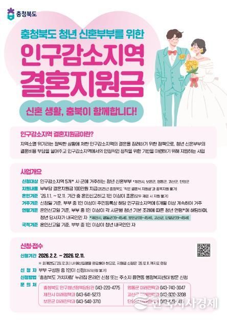 한국시사경제 충북취재본부 | 충북 괴산군은 청년들의 결혼 초기 경제적 부담을 덜고 안정적인 지역 정착을 돕기 위해 ‘2026년 인구감소지역 결혼지원금 사업’을 본격 추진한다고 5일 밝혔다.