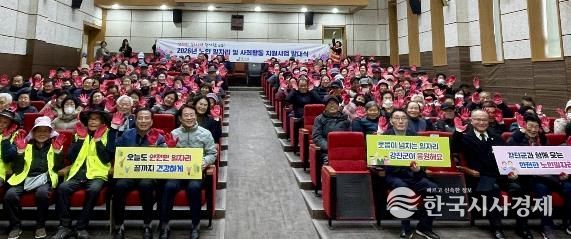 사회자의 구호에 맞춰 “머리안전-모자착용”, “손보호-장갑착용”, “몸안전-조끼착용”을 함께 외치고, 강진원 군수가 노인일자리 대표에게 모자·코팅장갑·형광조끼를 착용시키는 방식으로 진행된 퍼포먼스는 참여자들이 안전수칙을 쉽고 명확하게 체득하도록 했다.