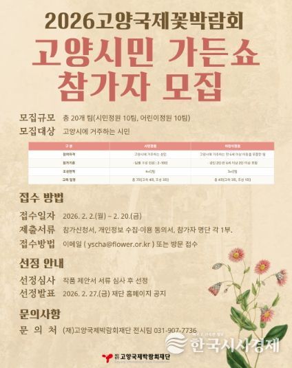 한국시사경제 윤광희 기자 | (재)고양국제박람회재단이 오는 4월 24일 일산호수공원에서 개최되는 2026고양국제꽃박람회의 시민 참여 프로그램 ‘고양시민 가든쇼’의 참가자를 이달 20일까지 모집한다.
