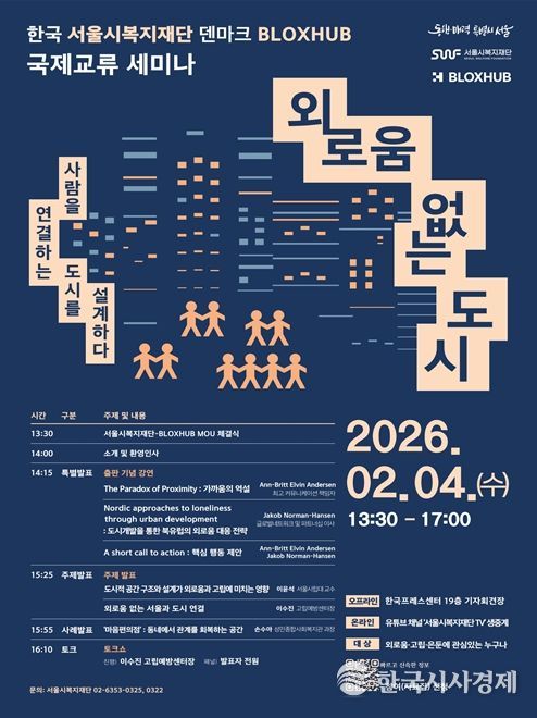한국시사경제 문화팀 | 국내 최초로 외로움을 의제 삼아 정책을 추진하고 있는 서울시와 서울시복지재단이 덴마크의 블록스허브(BLOXHUB)와 ‘외로움’을 주제로 국제 교류 세미나를 열고 업무협약을 맺었다.