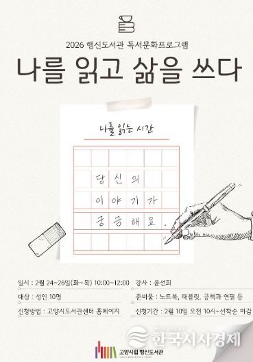 한국시사경제 윤광희 기자 | 고양특례시 행신도서관은 일반 성인을 대상으로 하는 글쓰기 프로그램 ‘나를 읽고 삶을 쓰다’를 운영한다.