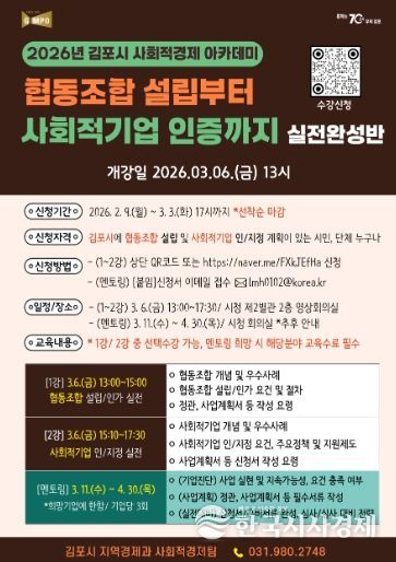 한국시사경제 기동취재팀 | 김포시가 사회문제 해결을 위한 참신한 아이디어와 실행력을 갖춘 사회적경제기업 육성을 위해 ‘2026년 김포시 사회적경제 아카데미’를 개설하고, 오는 3월 3일까지 수강생을 모집한다.