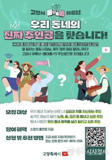 한국시사경제 권충현 기자 | 고양특례시가 44개 동 주민들이 직접 주인공으로 참여하는 신규 유튜브 예능 콘텐츠 ‘동대동(우리 동네 대결)’의 본격적인 제작을 앞두고 ‘우리 동네 대표 선수’를 모집한다고 9일 밝혔다.