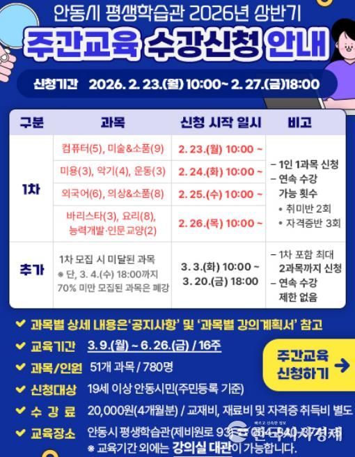 한국시사경제 경북취재본부 | 안동시 평생학습관은 오는 2월 23일부터 2026년 상반기 주간교육 수강생을 모집한다. 교육은 3월 9일부터 6월 26일까지 4개월간 진행되며, 총 51개 강좌에서 780명을 모집한다.