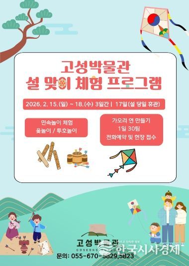 이번 설 연휴 체험 프로그램은 오는 2월 15일부터 18일까지 3일간 진행되며, 설 당일인 17일은 휴관한다. 고성박물관을 찾는 관람객 누구나 참여할 수 있는 민속놀이 체험과 가족 참여형 체험 프로그램으로 구성됐다.