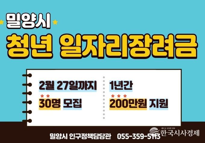 한국시사경제 노승선 기자 | 경남 밀양시는 취업 초기 청년들의 안정적인 지역 정착을 지원하기 위해 오는 27일까지 ‘2026년 청년 일자리 장려금’ 지원 대상자 30명을 모집한다.