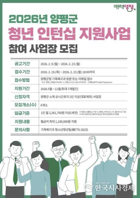 한국시사경제 기동취재팀 | 양평군은 인력이 필요한 관내 사업장과 관내 거주 미취업 청년을 연계하고 사업장에 인건비를 지원하는 ‘청년 인턴십 지원 사업’ 참여 사업장을 오는 2월 19일부터 23일까지 모집한다.