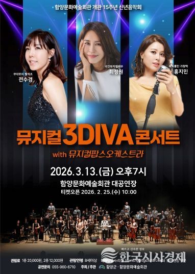 한국시사경제 김숙영 기자 | 함양문화예술회관은 오는 3월 13일 오후 7시 신년 음악회 ‘뮤지컬 3DIVA’ 콘서트를 개최한다.
