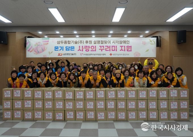 이날 행사에는 자원봉사자와 삼두종합기술 임직원 70여명이 참가해 떡국떡, 즉석국, 참기름, 견과류, 참치세트, 라면, 바디워시 등 총 13종의 생필품을 직접 포장한 후 울산시시각장애인 복지관을 이용하는 시각장애인 100세대에 전달하며 이웃사랑을 실천했다.