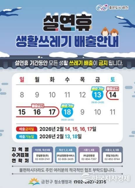 한국시사경제 기동취재팀 | 금천구는 설 연휴 기간 생활쓰레기(일반생활쓰레기, 음식물쓰레기, 재활용품) 수거를 일시 중단한다고 밝혔다.