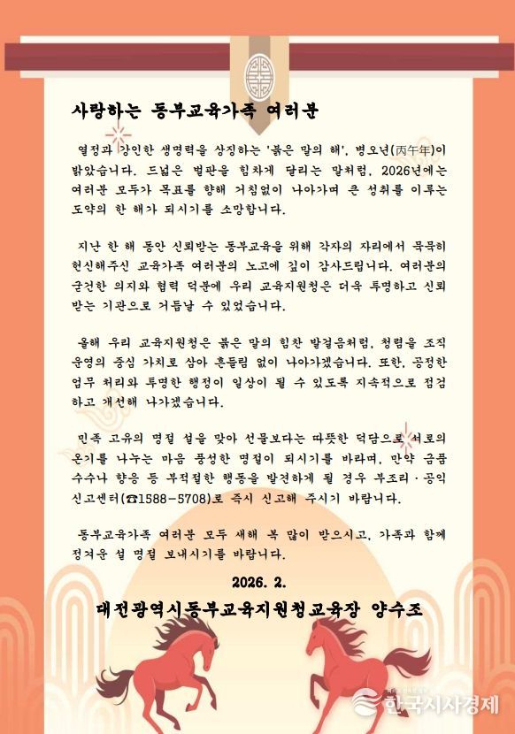 한국시사경제 대전취재본부 | 대전동·서부교육지원청은 설 명절을 맞이하여 청렴 실천의지를 담은 교육장 서한문을 관내 유·초·중학교 및 교육지원청 교직원들에게 발송했다고 밝혔다.