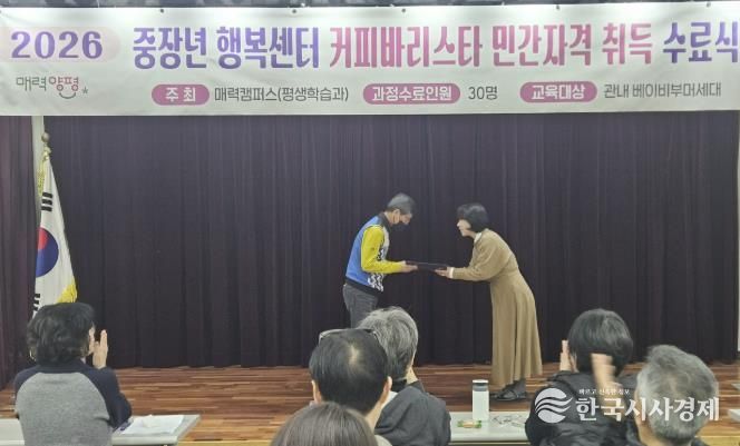 한국시사경제 윤광희 기자 | 양평군은 지난 11일 군민을 대상으로 운영한 ‘2026년 양평군 커피바리스타 신규 양성과정’을 3주간의 교육 일정을 마무리하고 수료식을 개최했다고 밝혔다. 이번 과정은 관내 베이비부머 세대의 역량 강화를 통해 사회 공헌과 재취업 기회를 제공하기 위해 기획·운영됐다.