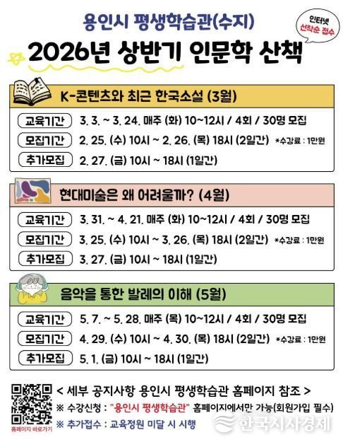 한국시사경제 사회팀 | 용인특례시는 25일부터 수지구에 있는 용인시평생학습관에서 인문학 산책 수강생을 모집한다고 13일 밝혔다.