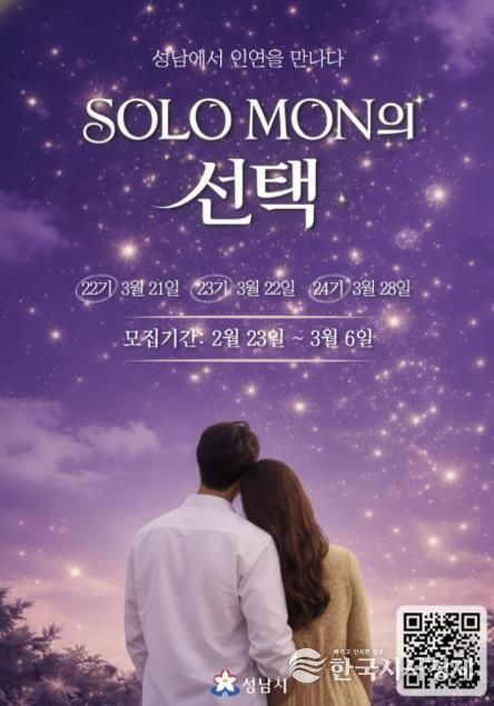 한국시사경제 경기취재본부 | 성남시는 오는 2월 23일부터 3월 6일까지 ‘솔로몬(SOLO MON)의 선택’ 22~24기 행사 참가 희망자 300명(남녀 각 150명)을 모집한다.