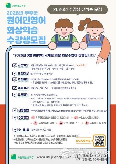 한국시사경제 김숙영 기자 | 무주군이 지역 내 초·중학생을 대상으로 ‘원어민 화상영어 지원사업’을 추진한다고 밝혔다. 이 사업은 지역 간 교육격차를 해소하고 글로벌 인재 양성을 위해 진행하는 것으로, ‘원어민 강사와의 1:1 화상영어 수업’ 수강료를 전액 지원한다.