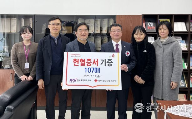 (재)김해문화관광재단(대표 최석철)은 지난 2월 11일, 지역사회의 혈액 수급 안정과 생명 나눔 문화 확산을 위해 임직원들이 자발적으로 모은 헌혈증서 107장을 대한적십자사 경남혈액원에 전달했다고 밝혔다.