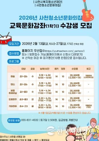 한국시사경제 윤광희 기자 | 사천시 복지·청소년재단 청소년문화의집은 청소년들의 재능 발굴과 건강한 자아 성장을 지원하기 위해 ‘2026년 1학기 교육문화강좌’ 수강생을 모집한다.