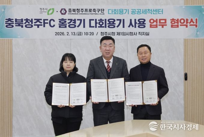 한국시사경제 사회팀 | 청주시는 13일 충북청주 프로축구단(충북청주FC), 다회용기 공공세척센터와 함께 충북FC 홈경기 다회용기 사용 확대를 위한 업무협약을 체결했다.