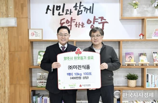한국시사경제 경기북부취재본부 | 양주시는 최근 ㈜미진식품로부터 이웃돕기 성품으로 백미 10kg 100포(400만 원 상당)를 기탁받았다고 밝혔다.