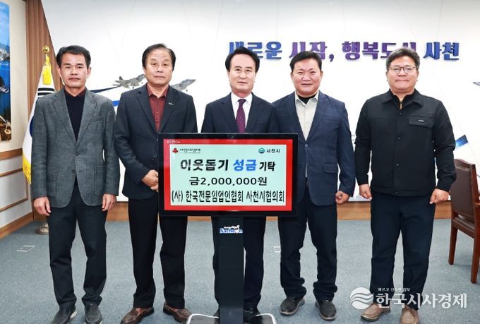 사천시 관계자는 “지역을 위해 나눔을 실천해 주시는 한국전문임업인협회 사천시협의회에 깊이 감사드리며 기탁된 성금은 도움이 절실한 이웃들에게 소중하게 전달하겠다”고 밝혔다.