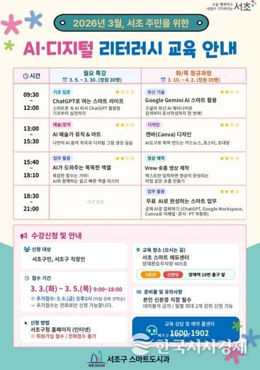 수강 신청은 3일부터 6일까지 서초구청 홈페이지의 통합예약에서 가능하며, 선착순으로 월별 두 강좌까지 신청할 수 있다. AI·디지털 리터러시 교육은 지난해 연간 2,000여 명의 수강생이 참여하고 90%가 넘는 높은 만족도를 기록한 인기 강좌다. 구는 올해도 매월 수준 높은 교육 콘텐츠를 제공하며 수강생들의 만족도를 한층 높여간다는 계획이다.
