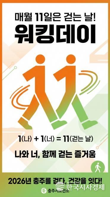 충주시 관계자는 “생활 속 걷기 실천이야말로 건강을 챙기고 지속 가능한 건강도시를 만드는 가장 쉽고 효과적인 방법”이라며 “많은 시민이 매월 11일 워킹데이에 참여해 일상 속 걷기의 즐거움을 누리길 바란다”고 말했다.
