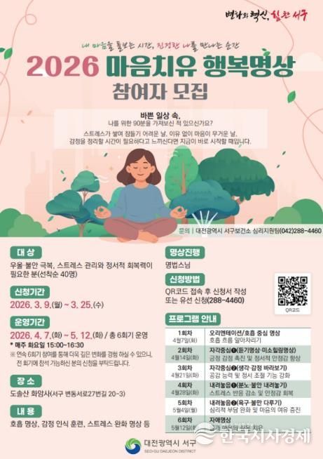 한국시사경제 대전취재본부 | 대전 서구는 바쁜 일상과 스트레스로 지친 구민들의 마음 건강 회복을 위한 ‘마음치유 행복명상’ 참여자를 모집한다고 9일 밝혔다.