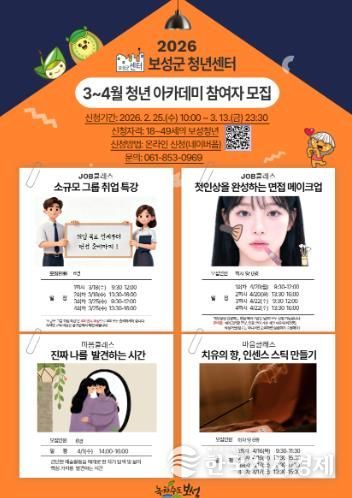 한국시사경제 권충언 기자 | 보성군은 청년들의 역량 강화와 정서적 안정을 지원하기 위해 오는 13일까지 ‘2026년 1차 보성군 청년 아카데미 프로그램’ 참가자를 모집한다고 밝혔다.