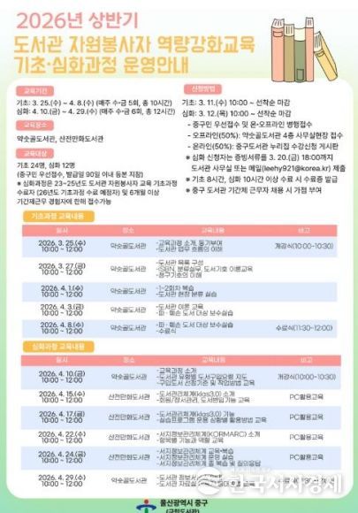 한국시사경제 울산취재본부 | 울산 중구가 도서관 운영을 활성화하고 자원봉사 문화를 확산하기 위해 ‘2026년 상반기 도서관 자원봉사자 역량 강화 교육’을 운영한다.