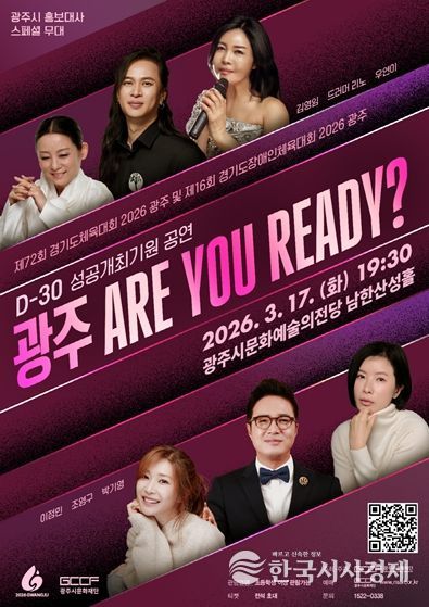 한국시사경제 이정이 기자 | 광주시문화재단은 오는 3월 17일 오후 7시 30분, 광주시문화예술의전당 남한산성홀에서 ‘제72회 경기도체육대회 2026 광주 및 제16회 경기도장애인체육대회 2026 광주 D-30 성공기원 공연’ '광주! ARE YOU READY?'’를 개최한다.