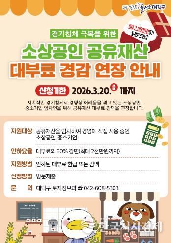 대덕구 관계자는 “지속되는 경기침체로 어려움을 겪는 지역 소상공인의 부담을 덜기 위해 지난해에 이어 대부료 감면 정책을 연장 추진하게 됐다”며 “앞으로도 지역경제 회복과 소상공인 경영 안정을 위한 지원 정책을 마련하겠다”고 말했다.