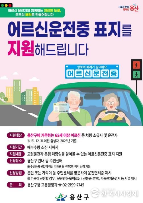한국시사경제 노승선 기자 | 서울 용산구는 올해도 고령운전자 안전을 위한 ‘어르신 운전중’ 표지 배부 사업을 추진한다고 밝혔다. 지난해 첫 시행에 이어 2년 연속 진행하는 사업으로, 고령 운전자를 배려하는 안전한 교통 환경을 만들기 위한 취지다.