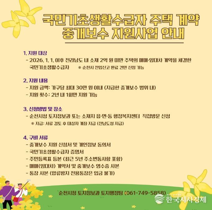 한국시사경제 문화팀 | 순천시는 주거 취약계층의 주거 이전 비용 부담을 덜어주기 위해 ‘주택 중개보수 지원사업’을 본격 추진한다고 밝혔다.
