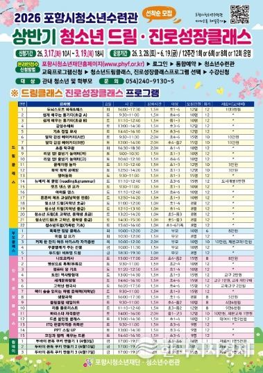 한국시사경제 노승선 기자 | 포항시청소년재단 청소년수련관은 청소년들의 흥미와 적성을 발견하고 진로 역량을 강화하기 위한 ‘2026년 상반기 청소년 드림·진로성장 클래스’ 수강생을 모집한다.