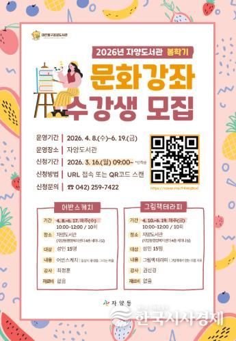 한국시사경제 대전취재본부 | 대전 동구는 ‘2026년 자양도서관 봄학기 문화강좌’를 운영하며, 이달 16일부터 동구 공공도서관 누리집을 통해 수강생을 선착순 모집한다고 밝혔다.