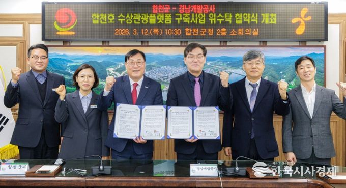 한국시사경제 노승선 기자 | 합천군은 12일 군청에서 합천호 수상관광플랫폼 구축사업의 원활한 추진을 위해 경남개발공사와 위·수탁 협약을 체결했다.