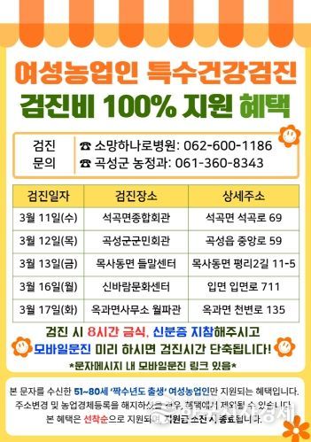 곡성군 관계자는 “여성농업인은 농작업과 가사 노동을 동시에 수행하면서 건강 관리에 어려움이 많다”라며, “이번 특수건강검진을 통해 직업성 질환을 조기에 발견하고 예방할 수 있도록 많은 관심과 참여를 부탁드린다”라고 말했다.