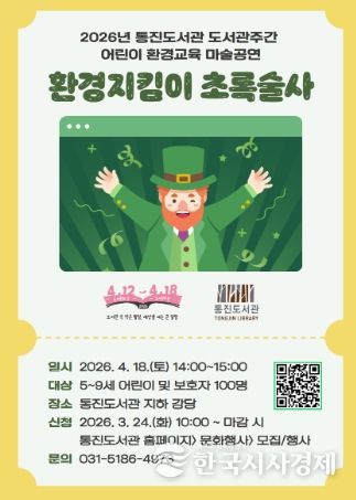 ‘환경지킴이 초록술사’ 공연은 4월 18일 오후 2시부터 3시까지 통진도서관 지하 강당에서 진행된다. 대상은 5~9세 어린이 및 보호자 100명이다. 참여를 원할 경우 3월 24일 오전 10시부터 통진도서관 누리집에서 신청하면 된다.